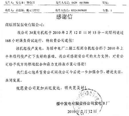 日前,綏中發(fā)電有限責(zé)任公司發(fā)電B廠發(fā)來感謝信,通報(bào)了我公司供貨的2000VZNM型立式循環(huán)水泵順利通過168小時滿負(fù)荷試運(yùn)行, 順利發(fā)電。綏中發(fā)電有限責(zé)任公司發(fā)電B廠,為2X1000MW超